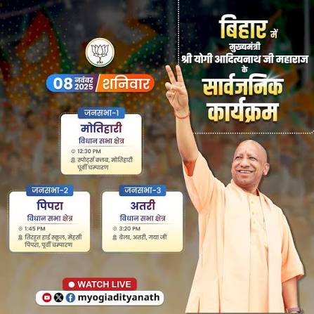 बिहार- मोतिहारी विधानसभा में सीएम योगी की जनसभा, बिहार चुनाव में लगातार प्रचार कर रहे CM योगी, लगातार भाजपा प्रत्याशियों के समर्थन में जनसभा, मोतिहारी की पावन धरा को नमन करता हूं- सीएम, पहले चरण में बिहार ने साबित कर दिया है- सीएम, रुझान बता रहे हैं बिहार में लालटेन की जगह नहीं, लालटेन की धुंधली रोशनी में अपराध नहीं होगा- सीएम, NDA सरकार की LED रोशनी से जगमगाएगा बिहार-CM, बिहार ने नालंदा विवि, आर्यभट्ट दिया- सीएम योगी, बिहार में साक्षरता में कमी के दोषी RJD, कांग्रेस- सीएम, RJD, कांग्रेस ने स्वार्थ के चलते विकास नहीं किया- CM, कांग्रेस-RJD के लोगों की दलाली से नौजवान निराश हुए, एनडीए सरकार में सुशासन की आधारशीला- सीएम योगी, अब बिहार में इनलैंड वॉटरवे, मेट्रो कनेक्टिविटी है- सीएम, अगर अपराधी जीतेगा तो निवेश भागेगा- सीएम योगी, यूपी में अपराधियों के लिए बुलडोजर खड़े किए हैं- सीएम, यूपी में माफियाओं की छाती पर धड़धड़ाता है बुलडोजर- CM, यूपी में बुलडोजर चलने से माफिया की हड्डी-पसली एक- CM, यूपी में माफिया पस्त, युवा रोजगार मिलने से मस्त हैं- सीएम.आज अयोध्या में राम मंदिर बनकर तैयार है- सीएम योगी, सपा ने रामभक्तों पर अयोध्या में गोलियां चलवाईं- CM योगी