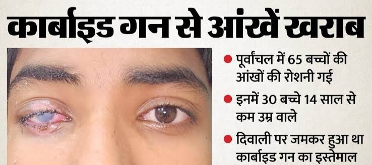 पूर्वांचल में कार्बाइड गन से 65 बच्चों की आंखों की रोशनी चली गई। इनमें 30 बच्चे 14 साल से कम उम्र वाले हैं। दिवाली पर कार्बाइड गन का जमकर इस्तेमाल हुआ था। बीएचयू और बनारस के निजी अस्पतालों में इनका इलाज चल रही है। दीपावली पर प्लास्टिक से बनी कार्बाइड गन से पूर्वांचल के 65 बच्चों की आंखों की रोशनी चली गई है। इनकी रोशनी वापस लाने का अब सर्जरी ही विकल्प है। यूट्यूब पर देखकर 300 रुपये में प्लास्टिक के पाइप से बनाई इस गन का दो महीने पहले दिवाली पर जमकर उपयोग किया गया। आंखें जख्मी हुईं तो पूर्वांचल और बिहार से बच्चों को बीएचयू, बनारस के बाकी अस्पतालों में इलाज के लिए लाया गया। इनमें से 30 से ज्यादा बच्चों की उम्र 5 से 14 साल है। 18 से 23 साल के 10 युवाओं की आंखों की रोशनी भी गई है।कार्बाइड के चलते इन बच्चों के आंखों की काली पुतली आपस में चिपक गई। इन बच्चों का दो महीने से इलाज चल रहा है। कुछ बच्चों की सर्जरी बीएचयू के क्षेत्रीय नेत्र संस्थान में जनवरी के दूसरे हफ्ते में होना है।